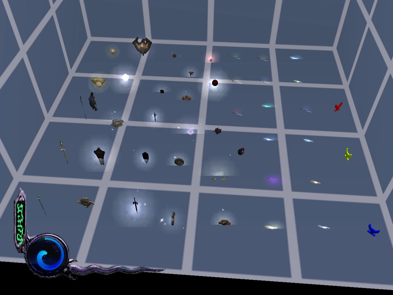 The room itself is something of a bare wireframe with steel blue/gray background and white 'wires' arranged in a square pattern. On the floor of the chamber were positioned a number of items with ever object and item found through the course of the game including four that were cut or otherwise removed.[Defiance][1]