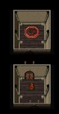 - Mortanius's chamber and Turel's pit in Defiance bears a resemblance to the area where Malek was punished by Mortanius in the initial cutscenes of Blood Omen[Defiance][Defiance/10][Defiance/13][Blood Omen][Blood Omen/8][Blood Omen/1] A similarly appearing area with a golden circular floor symbol and nearby pillars is also seen in the final area of the Hell dungeon in Blood Omen with a skeleton chained between two pillars - the skeleton is referred to in the official guide as Malek's remains, however the guide also claims the remains in Malek's Bastion as his - as does Malek himself.[Blood Omen][Blood Omen/8][Blood Omen/4][Blood Omen strategy guide] It is ultimately unclear if the areas were literally intended to be the same area or just similar chambers.[Blood Omen][Defiance] Similarly the throne seen in Mortanius's chamber in Defiance bears a remarkable resemblance to the throne Kain is seen sitting on in the bad ending of Blood Omen - perhaps hinting that Kain found the catacombs and took it before toasting his victory at the pillars.[Blood Omen/12][Defiance/10][Defiance/13]