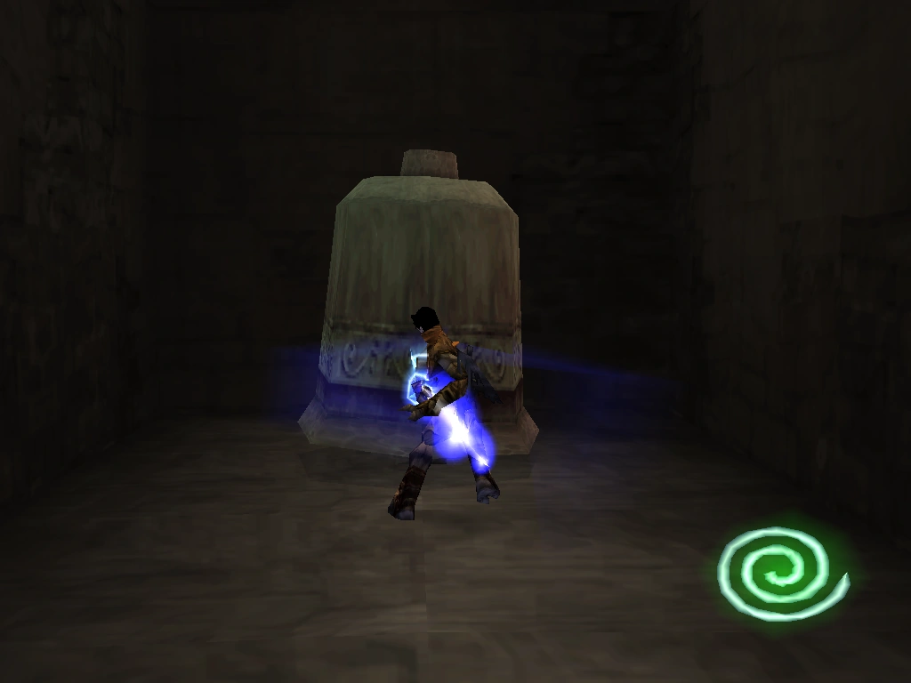 Raziel striking a puzzle bell in the Silenced Cathedral in Soul Reaver