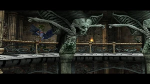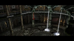 Returning the spear to the fountain room Raziel could use it to impale the appropriate Hylden statue, causing blood to flow into the pool rather than water. This in turn cracked the murals featuring the same spear changing them into breakable barriers that could be smashed open, enabling Raziel to access further into the mansion. When all three spears were collected and used to impale the Hylden statues, a warp to the Water Forge was created in the still pool.[Defiance][Defiance/8][Defiance strategy guide]