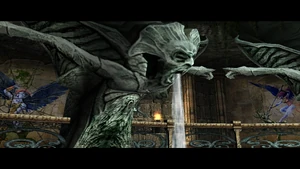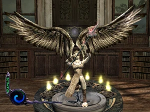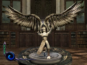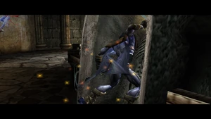 Progressing further into the mansion, Raziel soon found a statue of one of the champions in the library of the mansion. Activating several nearby DarkOrbs with the Light Reaver caused the Blood Drinker spear to appear in the hands of the statue, where Raziel could recover it.[Defiance][Defiance/8][Defiance strategy guide]