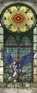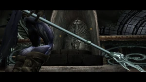 Like its fellow spears the Blood Drinker appears in the background environment of Vorador's Mansion in murals presumably depicting the Vampire-Hylden war. The spear is associated with a particular female ancient vampire champion - with the same champion depicted in the statue where the spear is gained and behind the appropriate statue in the fountain room. Most notably it is also seen on the door leading to where the spear is gained in the library. The depiction in question is labelled in files as "vd_library_b" and features the aforementioned female vampire holding the spear. Most of the murals featuring the vampire show her pinning a Hylden enemy to the ground and impaling him with the spear - this action is ultimately copied by Raziel on the Hylden statues in the fountain room.[Defiance][Defiance/8]
