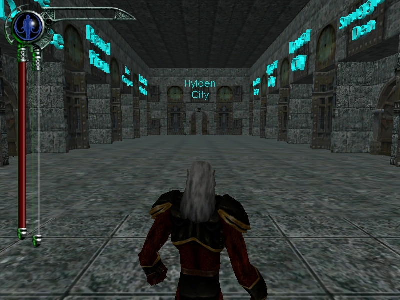 Bonus Mode, marked as "For Bonus Kain" in the files of Blood Omen 2, initially places Kain in a special stone-walled 'hub' room with several arched doorways. Each doorway has a simple blue text title above it, showing a title for each of the Chapters/Locations from Blood Omen 2. Each doorway, once entered, transported Kain to the entrance of the specific territory (though in some cases the position Kain appears in can make it impossible to progress. )[1][Blood Omen 2]