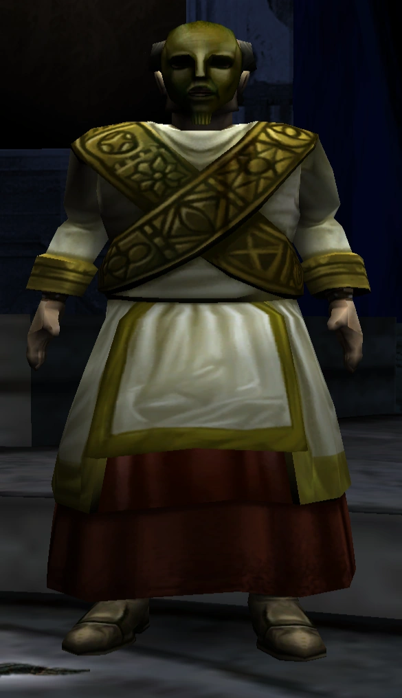 Like their summoner brethren, the Cenobite acolytes dressed in a creme-white robes with gold trim and maroon-red band around the bottom. A pair of patterned gold sashes were worn from the shoulders forming an golden 'X' pattern over the chest - and gold bands were also worn around the wrist. The class wore a golden 'greek-style' tragedy mask on their faces, but balding heads with horseshoe shaped thinning hair could be seen behind the masks. Primarily the class attacked with simple strikes and by summoning plumes of fire.[Defiance][Defiance/10][Defiance strategy guide]
