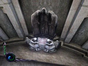 The Dark Scripture is explicitly named as such in the inventory and its name is reiterated in the official guide. In game files the Dark Scripture is labelled as "av_altarkey". A corresponding 'lock' texture labelled as "av_altarlock" is included in files but consists mainly of effects and does not include the altar itself which is counted as part of the environment. Curiously the 'lock' textures also include an image which appears to be the cut Blue Chalice.[Defiance][Defiance/10][Defiance/11][Defiance/12]