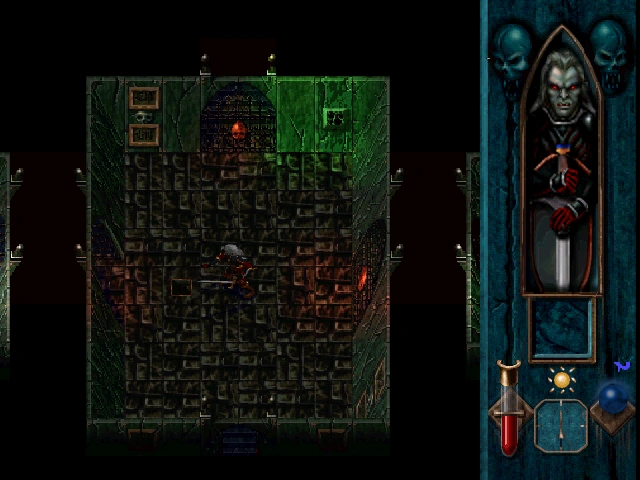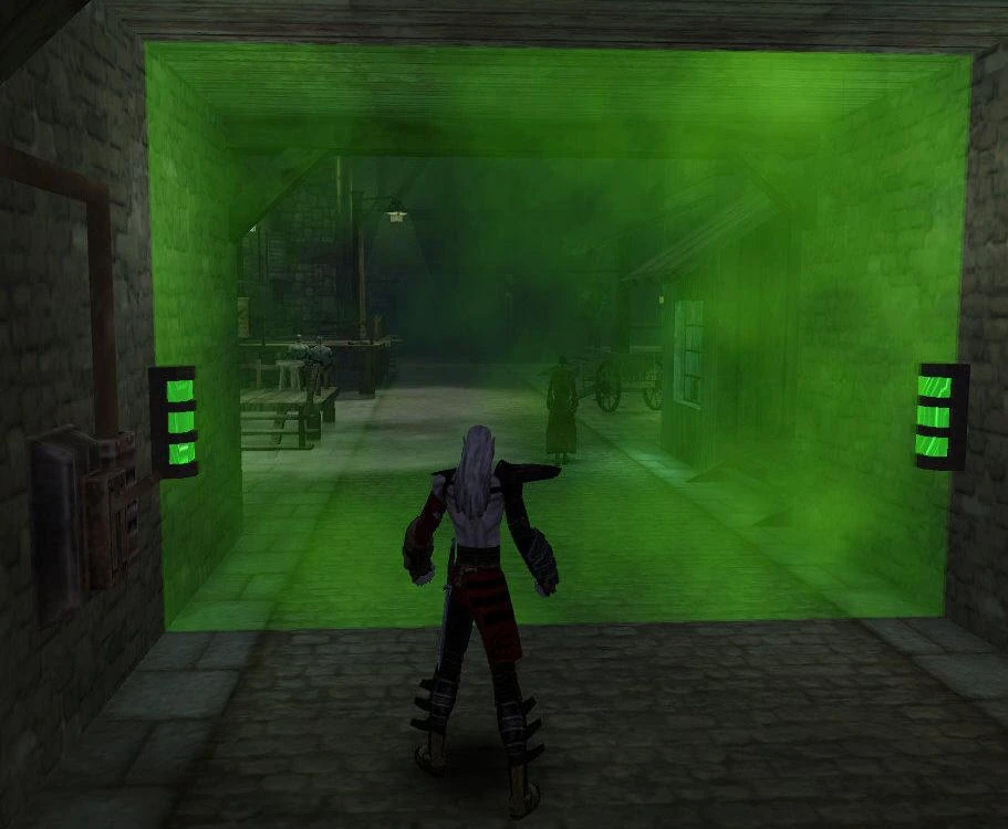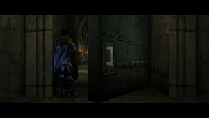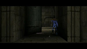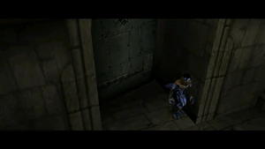 Doors were used throughout the series to break up areas. Blood Omen regularly used doorways to mask loading, with many doorways effectively teleporting the player to a different map area - often giving the impression that internal areas appeared larger than external ones.[Blood Omen] This effect was notably lessened in Soul Reaver with each door opened playing a short cutscene of Raziel pushing them open - these did not necessarily mask loading times however as nearby areas were in fact streamed as Raziel approached.[Soul Reaver] This trend of cutscenes and streaming loading continued into Soul Reaver 2, Blood Omen 2 and Defiance.[Soul Reaver 2][Blood Omen 2][Defiance]