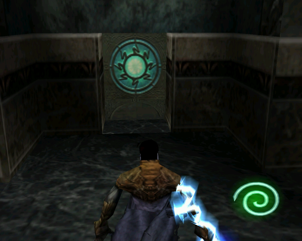 For the transition to 3D in Legacy of Kain: Soul Reaver doors became true interactable objects for the first time, now requiring the use of the action button to make Raziel physically push them open. Raziel could encounter regular doors from the end of Underworld (chapter) as he made his way to the outer entrance of the Sanctuary of the Clans. As with Blood Omen, several other doorways could be seen which required other conditions to be met to open them - all needed the interaction of the Material Realm to function and would be immovable in the Spectral Realm - although other mechanisms required the use of Switches or particular abilities or objects. Certain doors marked with a blue sun-like symbol led to special Warp gates.[Soul Reaver][Soul Reaver/2][Soul Reaver manual (US)][Soul Reaver manual (UK)][Soul Reaver strategy guide (Prima)]