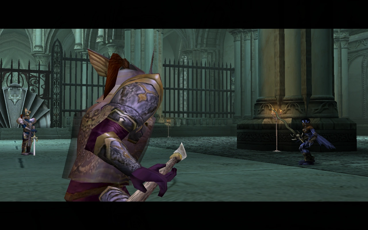 When Raziel reached the Sanctuary area of the Stronghold, portcullises (and other locked gates) sealed the exits and he was he was confronted by the second pair of inquisitors - Dumah and Rahab. Unlike other 'boss' battles in the series, the battles with the inquisitors had no puzzle aspect to them and were treated the same as any regular combat encounter - albeit against incredibly powerful opposition and with Raziel invincible due to the effects of the Reaver.[Soul Reaver 2][Soul Reaver 2/9]