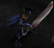 Falchions were first encountered by Raziel as he arrived in the Sarafan Stronghold in the Pre-Blood Omen era and met the first Vampire hunter swordsmen enemy variants (of Moebius's Vampire Hunters ) who would be armed with the broad Falchions as weapons. As Raziel traveled into the Era following Blood Omen he would again encounter these swords, this time held by the Demon hunter swordsmen of the Demon hunter faction.[Soul Reaver 2 ] [Soul Reaver 2 strategy guide (Prima)] .