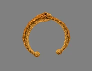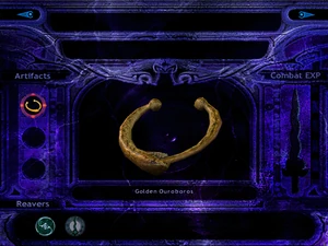In Legacy of Kain: Defiance, the Golden Ouroboros notably visually resembles (and is named after) the Ouroboros - a sign usually symbolizing an eternally repeating cycle, that is seen throughout Soul Reaver 2 and Defiance.[1][Soul Reaver 2][Defiance] The Golden Ouroboros is not a complete version of the symbol however, as the body of the snake is broken and fashioned into two spheres, presumably to fasten it to the wearer.[Defiance][Defiance/12]. When seen in Soul Reaver 2 the device seems to have a much simpler design, consisting of a plain gold band.[Soul Reaver 2][Soul Reaver 2/8][Soul Reaver 2/9]