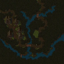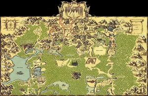 The Blood Omen 2 map presented the east end of the lake similarly, but at the western end the lake appeared to widen encompassing the previous eastern tributary (other tributaries were not seen) and flowing south-west between the settlements of Ziegsturhl and Provance before breaking into several smaller rivers which entered the Great Southern Sea. It is not clear whether these changes reflect the changing course of the waters in the Era following Blood Omen or simply design inconsistencies.[5][Blood Omen 2][Blood Omen 2/1] Simplified 'in-world' maps of Nosgoth are also found in Blood Omen on the floors of the Stronghold of William the Just and Avernus Cathedral's Heaven dungeon: in these the Southern Lake appears quite differently, shifted westwards and depicted as somewhat squashed and rotated, with courses flowing north-east from the lake towards the Swamp and Termogent Forest areas and another course heading north-west towards the Lake of Tears.[Blood Omen/8][Blood Omen/10]