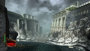The 'inner' lake was the first area encountered by Raziel in the history preceding Blood Omen and consisted of a large body of water, apparently fed by many small waterfalls. This area of the lake was bordered on the western side by the high walls (and balcony) of the main Sarafan stronghold, whilst the battlement wall crossing the lake covered the northern side of the area. A small surface area next to the stronghold provided access to the gear wheel necessary to open the passage under the stronghold, a checkpoint and a DarkReaver font. The remaining walls of the area were covered in cliffs, often with small waterfalls flowing down them, while a small island along one of the cliff-faces provided access to the Light Forge through a sealed door. Beneath the surface of the water of this area, a set of ancient ruins was visible, broadly consisting of a circular altar marked with the Spirit symbol and an aisle leading up to it decked out with Spiral symbols; with these remains representing the ultimately removed Spirit Forge. The 'inner' lake area was only present in the Pre-Blood Omen era and could not be accessed in other eras.[Soul Reaver 2][7][Soul Reaver 2/1][Soul Reaver 2/3][Soul Reaver 2/4]