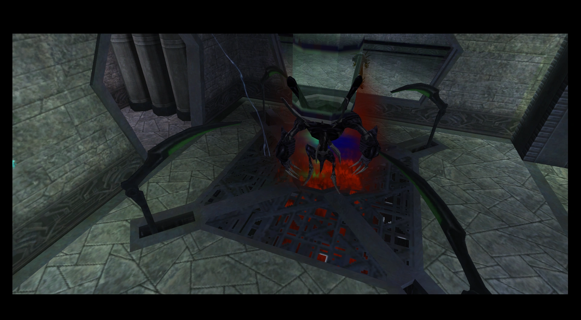 Greater Demons would play a larger role in Chapter 11: The Hylden City, where a Greater Demon released by Kain early in the level appeared to follow him causing great destruction through the city. The Greater Demons were completely impervious to Kain's normal methods of attack. Even his powerful Immolate Dark Gift was useless against them. The Demons were not impervious, however, as in the Hylden City, Kain managed to release one via mind-controlling a human from the other side of a thick sheet of glass. Once the Demon had killed the Hylden guard and the human, it stood in front of the sheet of glass closest to Kain, as though appraising how to reach him. Kain activated a Hylden energy streaming device, which the creature was standing on, and the creature's presence caused a massive explosion that shattered the thick glass, and massacred the creature into nothingness.[Blood Omen 2]