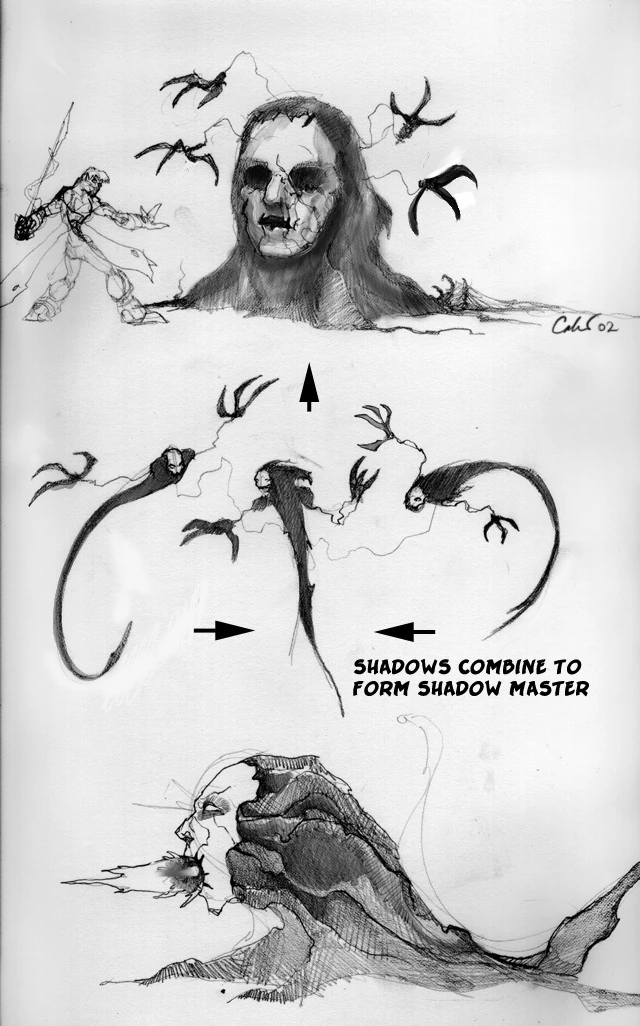 Shades are depicted in concept art from Daniel Cabuco's portfolio.[4] In the concepts they are named as "shadows" and are able to combine together to form a larger Shadow master form. [4] The name used also potentially relates them to the Shadows from Blood Omen: Legacy of Kain - dark spots that could coalesce into a humanoid cloud not unlike the Shades of Soul Reaver 2 - and the Necromancers who summoned them.[Blood Omen]