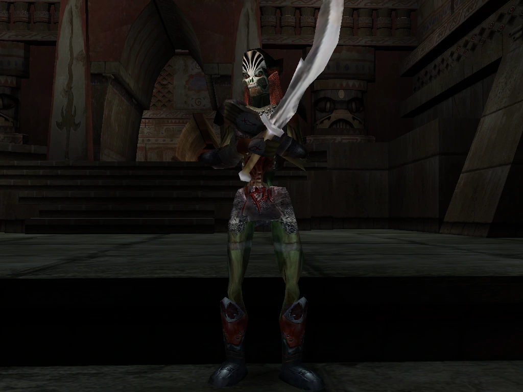 Greater Thralls were the strongest of the Thrall variant enemies seen in Soul Reaver 2. As with other thrall variants, Greater Thralls were undead warriors, re-animated and tasked with eternally protecting the sacred places of the Ancient vampires against intrusion, rising from underground to confront Raziel as he approached[Soul Reaver 2 manual][Soul Reaver 2 strategy guide (Prima)].[1] Visually Greater Thralls were large green-skinned, heavily decaying humanoids that wore a dark grey and red armor and chainmail, as well as a distinctive helmet design[Soul Reaver 2].