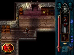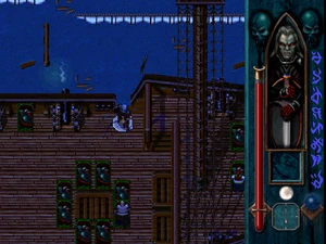Using this teleporter sent Kain to the deck of a largely destroyed ship, surrounded by major ship debris and trapped within a lagoon-like area. the remaining deck area above the waterline and a nearby rowboat contained a chest, four Font of putrescence artifacts and a single expert knife thrower. Several assorted Fonts of putrescence and Implode artifacts were hidden in the cliffs around the sides of the lagoon, and at the top of the lagoon there was a beach-like area with several lit torches which contained several Heart of Darkness artifacts, gold chests and further 'pirate' enemies including two more expert knife throwers, a gravedigger and a miner. Once completed, Kain had to backtrack to return to the rest of Nosgoth. [Blood Omen][1][2][3][4]