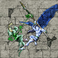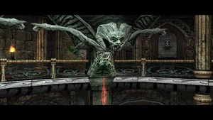 Returning the spear to the fountain room Raziel could use it to impale the appropriate Hylden statue, causing blood to flow into the pool rather than water. This in turn cracked the murals featuring the same spear changing them into breakable barriers that could be smashed open, enabling Raziel to access further into the mansion. When all three spears were collected and used to impale the Hylden statues, a warp to the Water Forge was created in the still pool.[Defiance][Defiance/8][Defiance strategy guide]