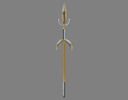 The item itself was a distinctive spear weapon made of a golden metallic material with a set of three curved spikes facing upward, while a larger set of three curved spikes faced downward on the hilt. Both spikes were usually curved as small 'bumps' against the spear but could be extended outward to form more formidable spiked areas.[Defiance][Defiance/8]