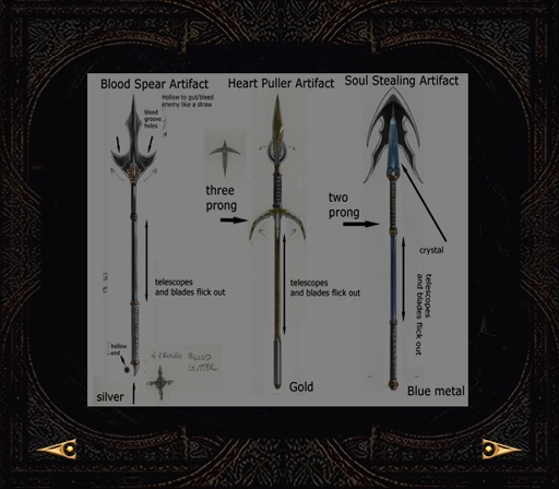 Along with being associated with a unique vampire champion and mural, each spear is also associated with a unique icon which represents the spear - in the case of the Heart Seeker a golden leaf shaped spear tip is seen surrounded by three silver curved 'claws' in a representation of the head of the spear, which is also seen on the platform where the champion statue is found. Each spear also has a unique target 'stab wound' in the back of the Hylden statue - in the case of the Heart Seeker a faintly golden almost 'T' shape - these are also depicted in the planning document in Bonus materials[Defiance][Defiance/8]