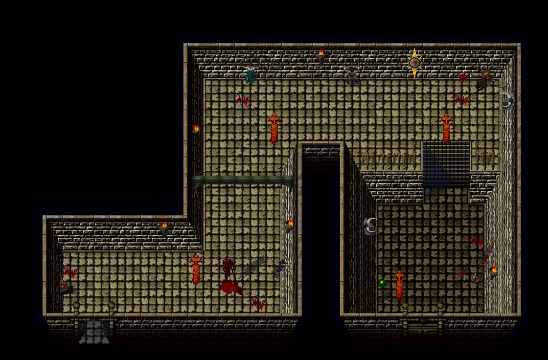 The next area was again populated by Cerberi and numerous shooters began as a corridor heading west before descending a stairway south to another wider western corridor which met another staircase overlooking a balcony and a lower square tier to the south. Kain could collect a blood beaker from the balcony before descending the staircase and afterward drain a chained human before pressing the star/shield-shaped switch on the northern wall and exiting via the eastern doorway.[Blood Omen][Blood Omen/8][Blood Omen strategy guide]