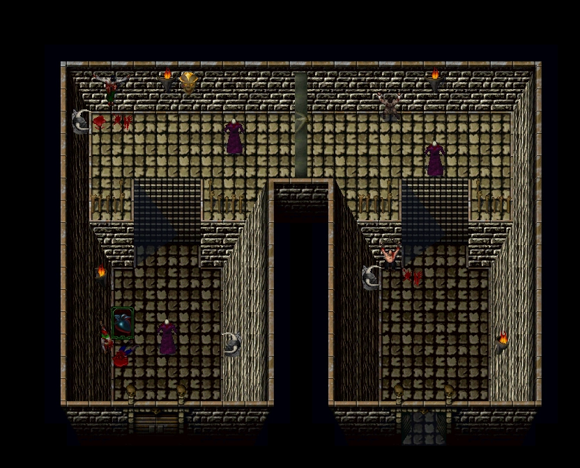 The next chamber was populated by Lich summoners and began as a corridor heading north which emerged as a balcony on the western side on a larger room. The balcony headed north before turning east where a southern staircase led down into the larger room below. Passing a green magic sphere at the bottom of the stairs, the path turned back around the bottom of the balcony in a 'J' shape before heading back northward and passing a rotating blade on a skull-topped pole. At the top of the room the corridor turned eastward, passing a captive to the north and emerging as a balcony along the north of another open room, with a blood beaker at the far eastern end. A stairway led south to the room below with a switch positioned at the bottom of the stairs which opened the exit doorway in the south. A green magic sphere was positioned opposite the skull switch, with a Blood beaker below it to the south, to the east of the exit door.[Blood Omen][Blood Omen/8][Blood Omen strategy guide]