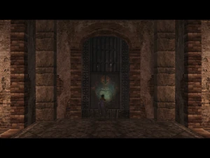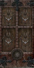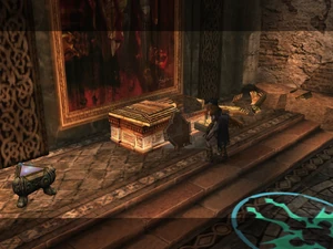 Kain's Family crest was a heraldic design and a quest item discovered by Raziel in Legacy of Kain: Defiance. As he explored the Cemetery in the events of Blood Omen, Raziel eventually gained access to a building he soon discovered was Kain's Mausoleum. Within the building, many of the walls were decorated with a distinctive emblem and at the far end of the main chamber of the mausoelum a sealed doorway was marked with a similar symbol. In a chamber nearby, Raziel found the grave of the humanKain with part of the emblem - the central shield - laying on the floor in front of the sarcophagus. [Defiance][Defiance/4][Defiance strategy guide]