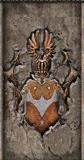 The name of the artifact suggests it is a 'family crest' or 'coat of arms' - a heraldic design generally understood to be associated with a noble family and originally used as an identifier in medieval tournaments and battlefields. However these identifications are technically incorrect: in real world heraldry only the design on the shield is referred to as the coat of arms, while the shield itself is generally refereed to as an escutcheon - the full version of the crest would be an achievement. The other components that Kain's design has include a pair of spiked supporters of unclear design (or mantling), a helm and a pair of wings atop the helm represent the true crest of the piece. While other elements varied with individuals, the crest remained constant through all members of the family - hence being associated as a 'family crest'. In common usage however, both family crest and coat of arms have become associated generally with heraldic symbols. Technically the helm used on Kain's achievement denotes a monarch.[4][5][6][7][8][9][10]