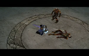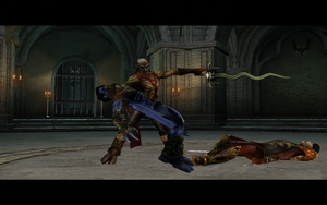 Breaching the stronghold, Raziel was able to recover the Reaver blade after a brief confrontation with Moebius and Malek and although wary of the ease with which he was able to find it, Raziel was left with little choice but to wield the sword as his own Wraith Blade was disabled by Moebius's Staff. As he progressed through the building, Raziel was confronted by each of the commanders in turn, finally appreciating that he had been their killer all along. Fittingly the last to confront him was his former human self, who met him in the Chapter House - where the deaths of the commanders had been memorialised years later in the history preceding Blood Omen - and Raziel realised that he was his own murderer as well.[Soul Reaver 2][Soul Reaver 2/9][Soul Reaver 2/Epilogue]