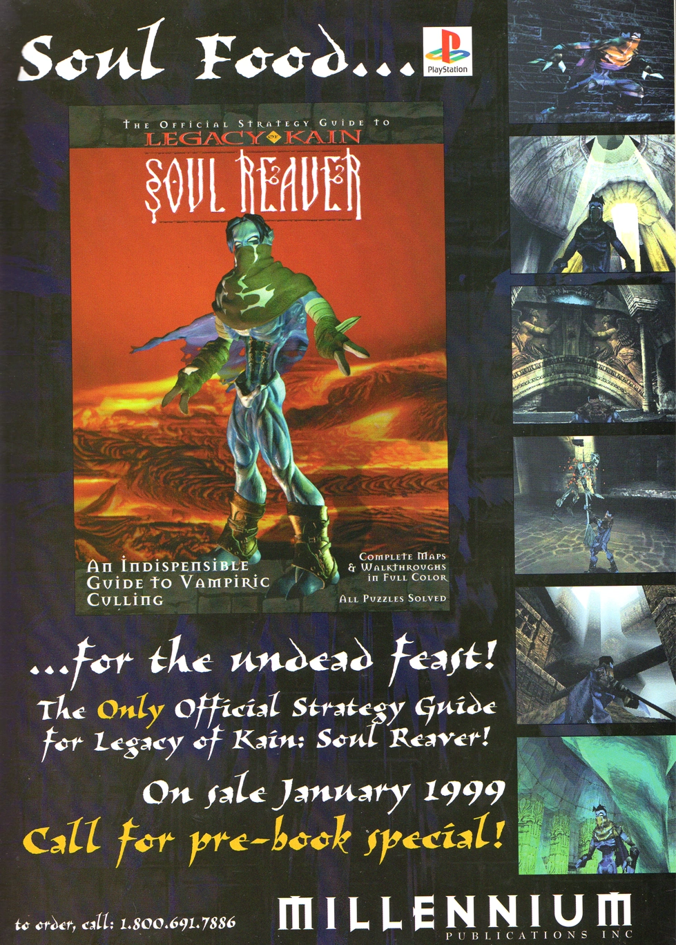 Pre-release magazine promotions feature an advert for a previous version of the official guide which reveal some striking differences: The guide was originally intended to be published by Millennium Publications rather than Prima Games and was supposed to be released in January 1999 - with the delays to the release of Legacy of Kain: Soul Reaver the release of the guide was pushed back by several months along with the rest of the title. Promotions for the early guide notably feature several cut or discarded elements with a render of Raziel on lava on the front cover and promotional images with an early Raziel render, the Sunlight Forge, an early Melchahim design and the Water Forge.