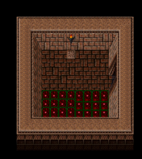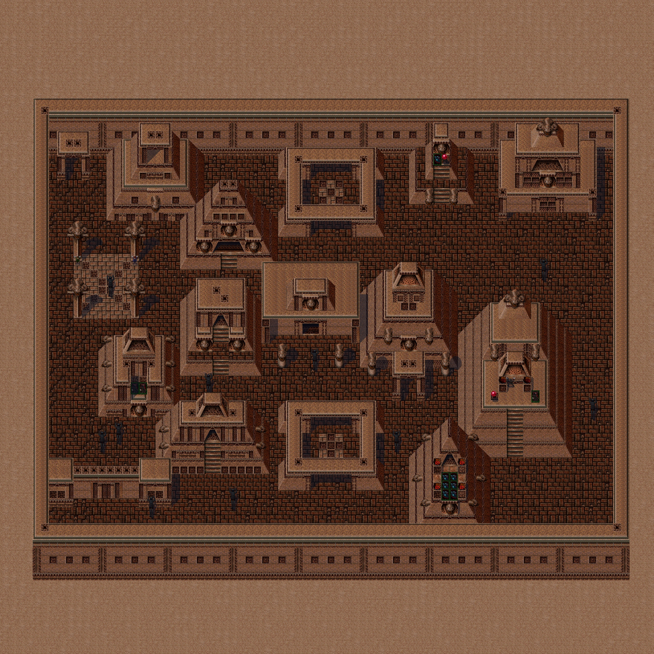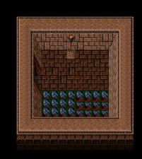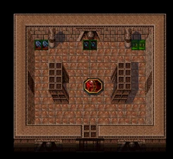 During the events of Blood Omen of the first timeline, the exterior of the city was primarily inhabited and defended by Werewolves, with its other major buildings internally guarded by Humans, Giant demons, Red Skeleton Knights, Malek's warriors and a single Will-O-Wisp. An enormous collection of battle artifacts was housed within its expansive confines, and several human prisoners could be found shackled to pillars and walls. Kain was only able to access the city via a teleporter on a small island at the heart of the Lake of the Dead, within a stonehenge. A Moon Gate blocked the exit of the room housing the teleporter - therefore, the rest of the city could only be visited on a full moon. It was unclear whether the city was adjacent to the Lake of the Dead, beneath the lake, or somewhere entirely different.[Blood Omen]