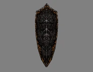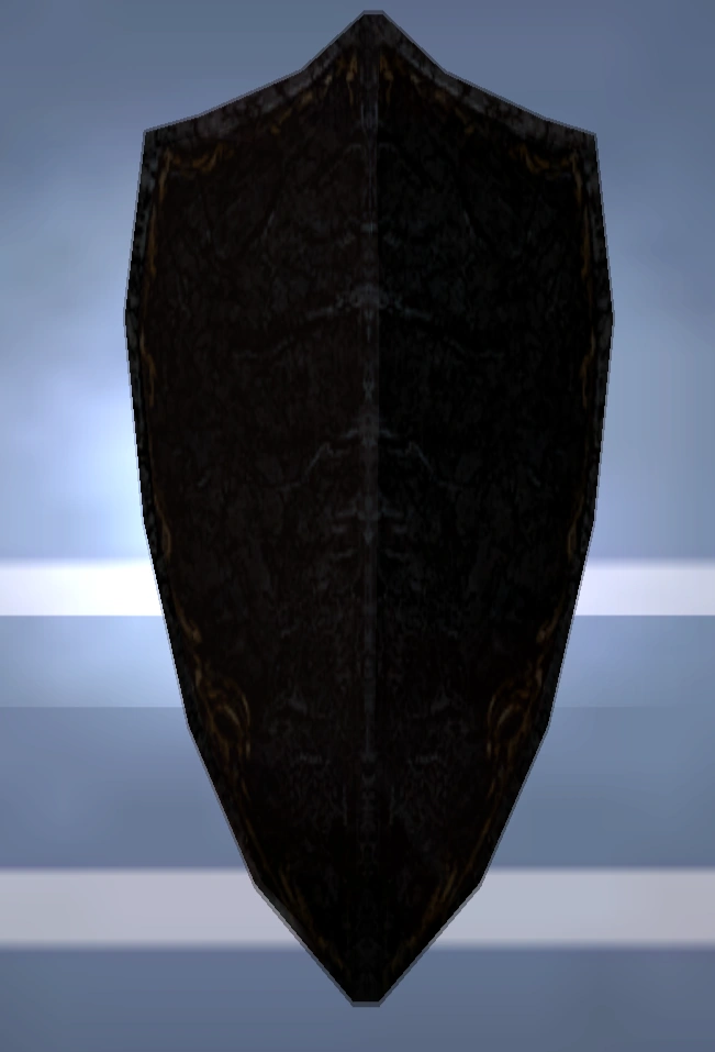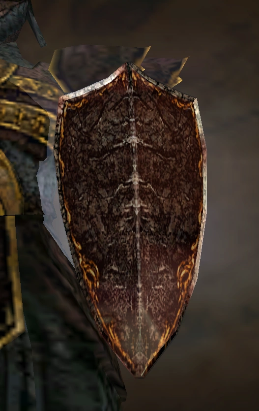 The shield itself was a relatively plain arifact, consisting of a simple brown kite shield which was peaked at the top and bore a golden trim along its outer edges and subtle symmetrical white markings across the centre of the shield. It was likely intended for decorative rather than functional purposes.[Defiance][Defiance/3]