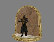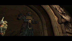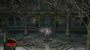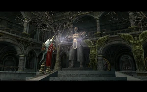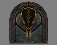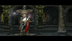 Returning the shield to Malek's statue in the cloister dispelled the barriers protecting the 'Shield Mural' door, allowing Kain to ascend to the upper levels of the 'cloister' courtyard and the 'main battlements' area, where he found another statue of Malek holding Malek's Sword.[Defiance][Defiance/3]