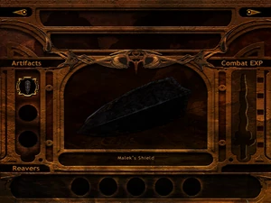 As Kain moved through the stronghold he used the Falcon Insignia to open the way to the upper levels of the chapter house and Sanctuary area, finding his way to the relic room on the second level balcony. In this chamber he found another empty- handed statue of Malek, but by moving a nearby block and triggering a floor-pad mechanism, the statue revolved revealing an identical statue holding Malek's Shield.[Defiance][Defiance/3]