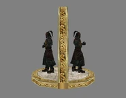 Bonus materials and the Prima official guide depict early concept art of Malek's statue showing it in various states of being armed with the shield and sword. The artwork perhaps suggests that the statue was originally to be positioned on a circular plinth against a wall - as it appears in the relic room. The order of the items added to the statue also suggests that early designs may have had the sword gained first whereas in the final game the shield is the first to be gained - this is supported by game files which list the shield as "shold_artifact_three" and the sword as "shold_artifact_two". The artwork itself seems to have been adapted to create the 'solution' mural between the doors - notably however there are differences, with the actual statue holding the shield at a different angle and the sword being held upward rather than downward as depicted in the mural, although the initial sword statue also holds the sword downward.[Defiance][Defiance/1][Defiance/3][Defiance strategy guide]