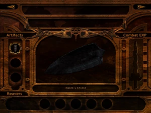 Malek's Shield is explicitly named as such in the inventory and its name is reiterated objectives and in the official guide.[Defiance][Defiance/1][Defiance/3][Defiance strategy guide] It is also referred to in objectives and dialogue as "Malek's missing shield" and simply "the shield" or "his shield" in reference to Malek.[Defiance][Defiance/1][Defiance/3] Game files list the item as "shold_artifact_three" and the corresponding doorway as "shold_arttwo_b". A corresponding 'lock' texture labelled as "shold_lock_three" is included in files but consists mainly of effects and does not include the statue itself which is counted as part of the environment. Curiously the 'lock' textures also include an image which appears to be the cut Blue Chalice.[Defiance]