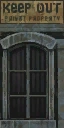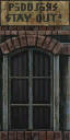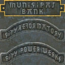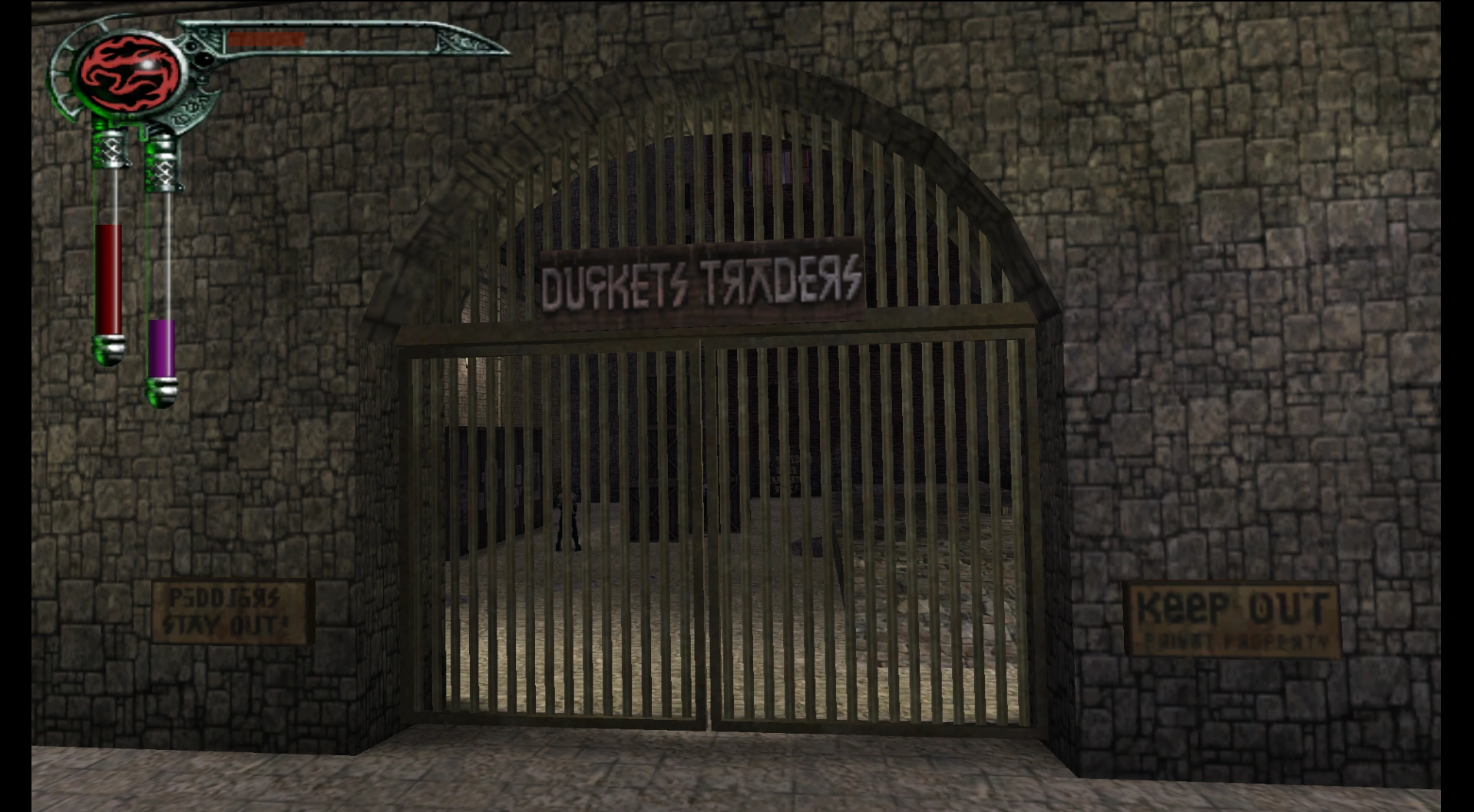 Meridian's Written Languages could be observed fromChapter 1:the Slums, where the 'ordinary font' made infrequent appearances, featured on signage and newspapers blowing through the city. As Kain progressed through the lower areas of the city, more and more written text was observed (presumably indicating higher rates of literacy) and the ordinary 'combined language' font was gradually replaced by the more official looking 'Meridian Script'. This practice reached a peak in Chapter 3:The Lower City, where the numerous businesses had signs written in the script and only a few businesses kept to the French/Slavic 'ordinary font' (notably the "Auberge Du Roitre","Gaestrobog"and "Gospikon" signs). Later levels used no text, instead relying on icons and picture signs[Blood Omen 2].