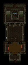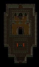 The first area consisted of three square rooms in succession. The first room was bore the Mist Form item card in the center and had a door on the western wall which led to another square room containing a save altar (which constituted the only room of the second map area). On the northern was a closed door which acted as a permeable barrier flanked with four statues which led onto the next room. The second room was partially flooded apart from two patches in the east and west of the room where two miners were situated. A number of skulls could be observed on the floor and a large open door in the north led to the next room. The third room was flooded only in patches in the north and south with a large permeable door leading to the next map area.[Blood Omen][Blood Omen/6][Blood Omen strategy guide]