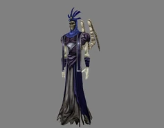 She was dressed in blue garbs with a large, sweeping feathered headdress on her head. Her visage reflected long dwelling within the Spectral Realm as a wraith after she died.