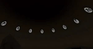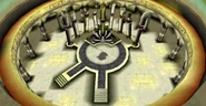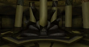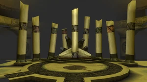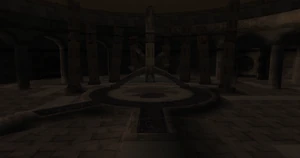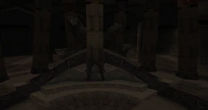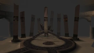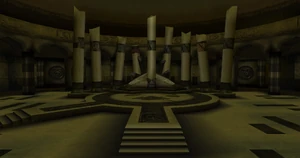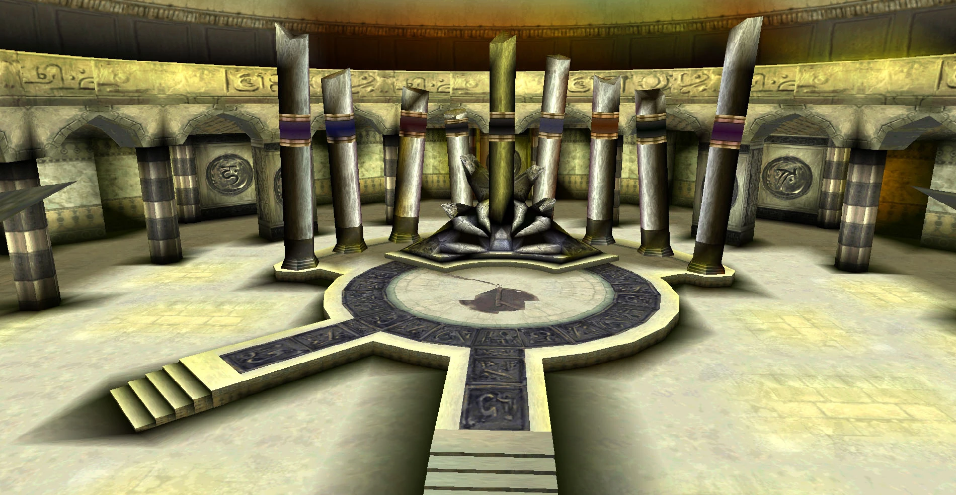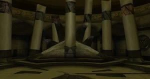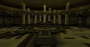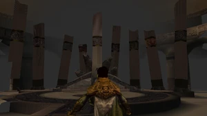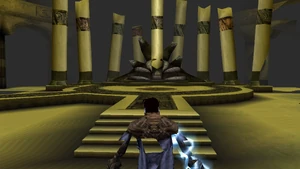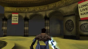 The Pillars area appears somewhat different in the Soul Reaver alphas and some kind of texture progression is seen through the builds: with the room starting off as a set of broken and unfinished textures and finishing in more familiar arabian inspired designs with clan symbols. The throne setup changes with successive builds starting as carved into a 'lump' that raises the dais ring, being placed over the ring and finally gaining its own spiked backing. The domed ceiling notably contains several small stained glass windows decorated with clan symbols, but these are replaced by plain windows in later builds - these windows are removed by the time of beta versions.