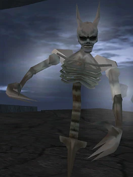 Poltergeists appeared as a floating ghostly skeletal torso, missing a lower body and with large horns and claws. They appeared only in the 'limbo'[2] area of the Eternal Prison, where once the machinery was activated, the poltergeists materialized as Kain climbed the floating platforms,[1] glowing white until they were defeated[Blood Omen 2].