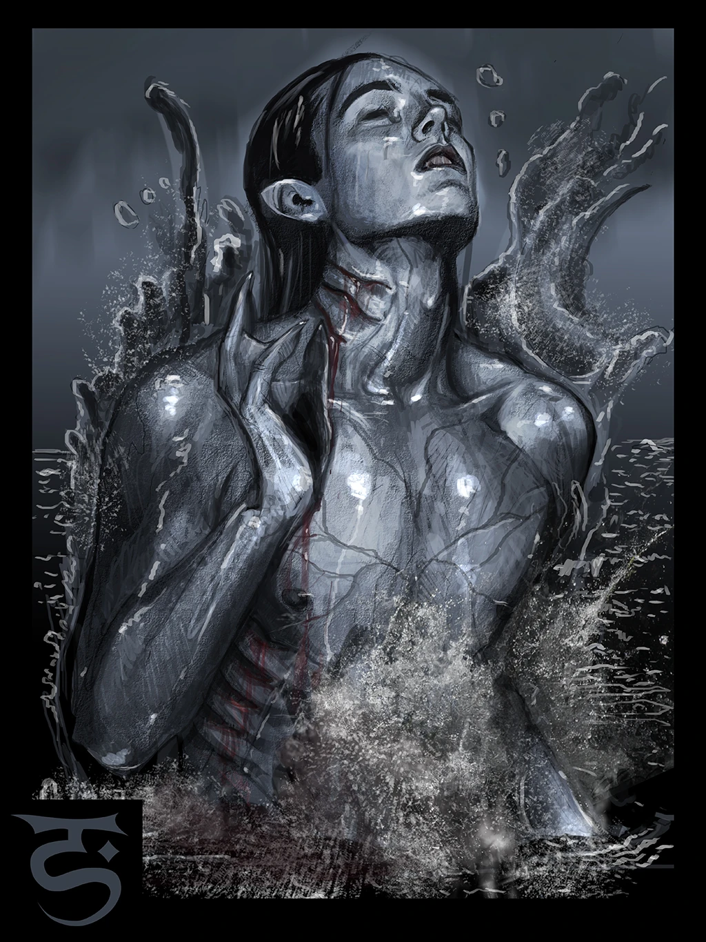 So he'd burn and heal, drink blood and immerse.. perhaps doing so at the same time (Telekinetically drinking) until the image I painted happened: The gills.. the GILLS! They symbolize his newfound power, one that he would present to Kain in court, to drive the others into jealousy and supplication to him. He'd move up the chain of value.. become Kain's favored for that decade.. maybe that century!