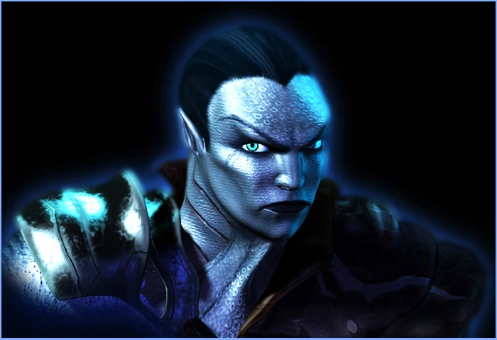 In Legacy of Kain: Soul Reaver, vampire Rahab was of lightly fit build and as tall as Raziel, his hair was in a short ponytail. He had scaly bluish skin with gills on his neck (likely due to a result of his adaption to water). He had bright blue eyes with the standard empire equipment with a dark blue cape with the Rahabim symbol.