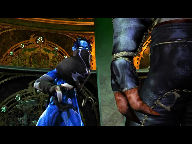 On the advice of Ariel and the Elder, Raziel pursued Kain into the Oracle's Cave, recalling the story of Moebius the Time Streamer.[Soul Reaver/Miscellaneous][Soul Reaver/13][Soul Reaver/14] Passing through the Chronoplast, he saw several visions of potential futures, but dismissed these as "Kain's deceptions".[Soul Reaver/15] In the "bowels" of the clockwork, he met Kain at last. Raziel fought with furious passion, defending the name of the Sarafan as "saviors", but Kain knew better. Unfazed by Raziel's attacks, he activated the Chronoplast's portal, and strode through, into Nosgoth's past. Raziel followed in close pursuit, but emerged from the ether in an unfamiliar chamber - met by Moebius.[Soul Reaver/15]
