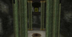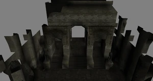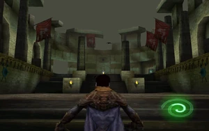 Under the archway was a small interior area beneath the arch with a tall block and high grate blocking access to a Health power-up. Through the other side of the archway was another large outer area. Again bearing decaying brickwork and tall crumbling battlement walls, this area had several columns and shallow patterned alcoves lining each side and a double tiered three-wide staircase in the middle which was flanked by torches and shields. The staircase led up to an altar with a bowl of fire in front of a Razielim symbol encircled on the wall. A door to the right led down a narrow stairway to the Warp gate room while the other doorway led deeper into the territory.[Soul Reaver][Soul Reaver/3]