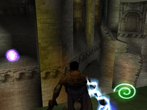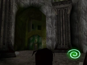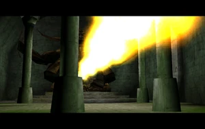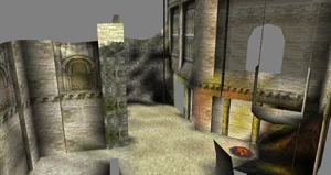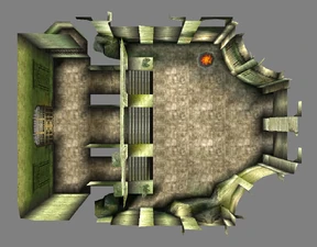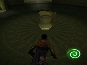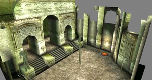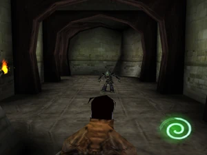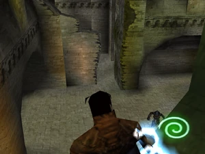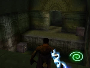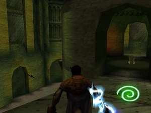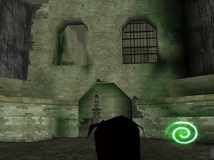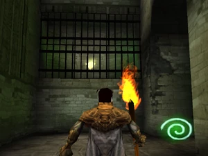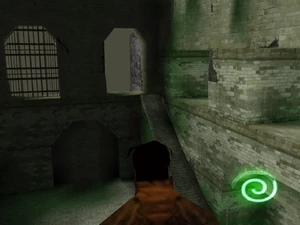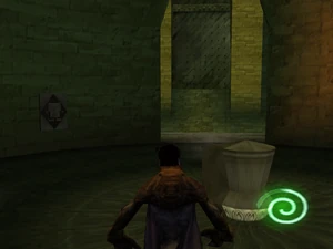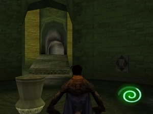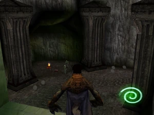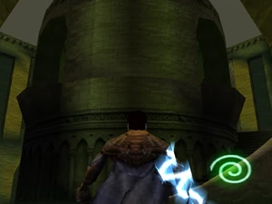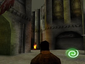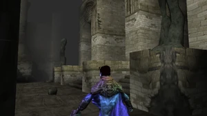 If Raziel ignored the flooded areas he could follow the wide corridor to the right away from the 'T' junction. Here the wide corridor turned to the right then left and rose in a series of slopes with a pair of shallow alcoves containing urns. After the left turn the corridor passed through a gate and then opened into a small square courtyard surrounded by high crumbling walls. A gap between the wall to the north led out to a much wider open area with high walls and a bonfire to the north east - the courtyard here extended to the west where an open arch led to through to the a large octagonal courtyard with a prominent circular tower at the center.[Soul Reaver][Soul Reaver/3]