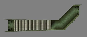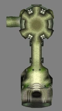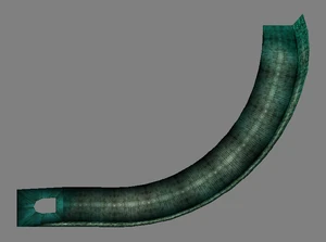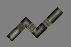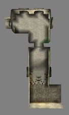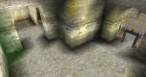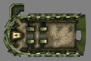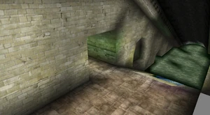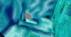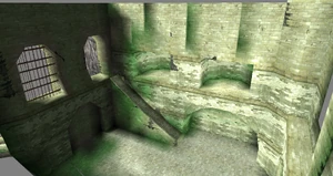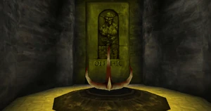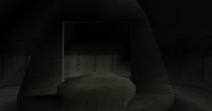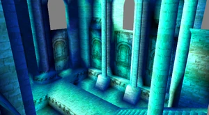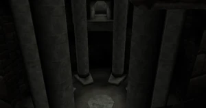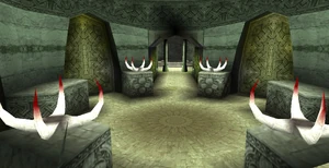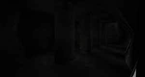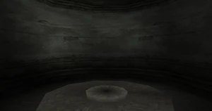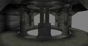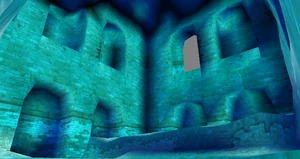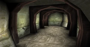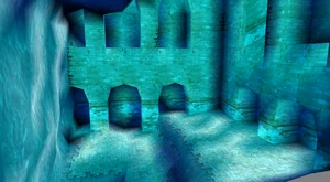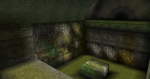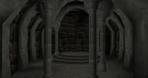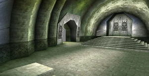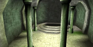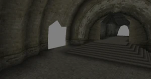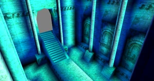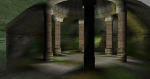 The southern passage led down a curved passage to another open square shaped room, with brickwork and arches similar to the Razielim territory visible along it northern and eastern walls. The other walls however were plain rock and the bottom of the chamber descended in a series of steps to an low opening in the south-west of the chamber. Beneath this a corridor of plain rock and uneven stepped surfaces led down to another a cylindrical cistern-like room with a high domed ceiling and ornate decoration on the walls which signaled a shift toward the theming of the abbey. A low opening led down a long narrow curved passage to the an archway which opened into the lower levels of the church area of the Drowned Abbey nearby the Fire Forge.[Soul Reaver][Soul Reaver/3][Soul Reaver/10][Soul Reaver/11]