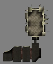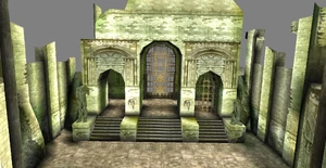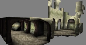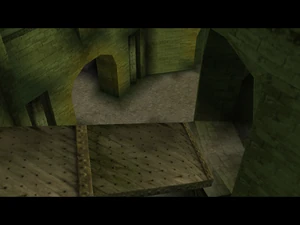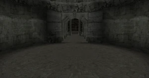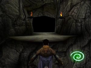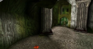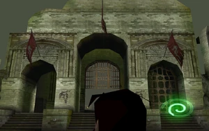 The initial passageway was a curving passage with rocky wall leading westward from the Abyss. It led to the first brickwork area - a wide corridor with several shallow alcoves along the wall and wooden arches. A door to the north led to a narrow outer courtyard area surrounded by high brick battlement-styled walls. A pair of arches to the east with solid Razielim portcullises led through to the first significant rooms of the area.[Soul Reaver][Soul Reaver/3]