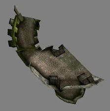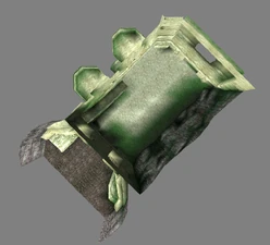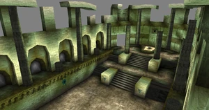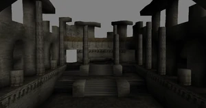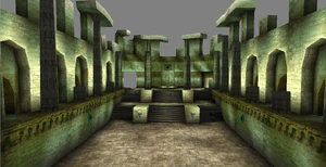 The final courtyard of the Razielim territory consisted of a wide open space hemmed in by the the distinctive high battlement walls, brickwork and arch designs characteristic of the territory. A series of shallow alcoves and arches dotted the walls and a ramp led up to a par of openings on the far wall - one of which was covered by a gate. A set of steep steps marked the transition from brickwork to plain stone and a more natural wide open area with a small cave containing a bonfire to the south. Three distinctive columns in this area bore the distinctive designs associated with the Necropolis and gateway to the north was marked with several Melchahim designs, signalling the entrance to their territory.[Soul Reaver][Soul Reaver/3]