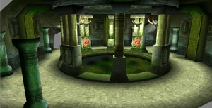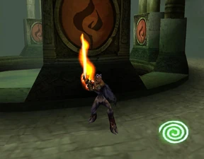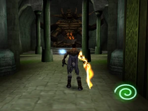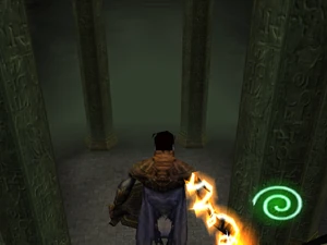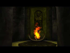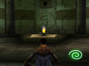 The Fire Glyph altar was accessed from the initial flooded room of the clan territory from the second level eastern arch. The passages here sloped downward and curved before emerging into a circular pool at the center of Fire Glyph altar area. Rising and exiting the water Raziel could enter the area and seek the Fire Glyph.[Soul Reaver][Soul Reaver/Fire]