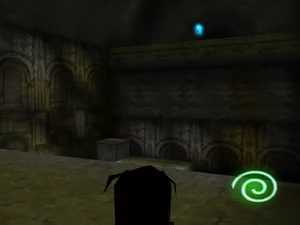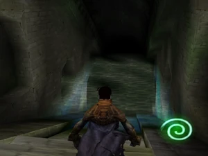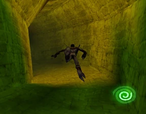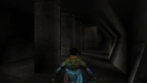 The left hand doorway led into a narrow corridor which reached a 'T' junction and widened with a choice of directions. To the right the corridor continued further into the territory and on toward the Octagonal courtyard area. To the left however a slope led steeply downward, with a broken stairway visible dropping below into an area beneath the main territory which was submerged with Water. If Raziel had the ability to swim at this point he could fully explore the flooded passages below.[Soul Reaver][Soul Reaver/3]